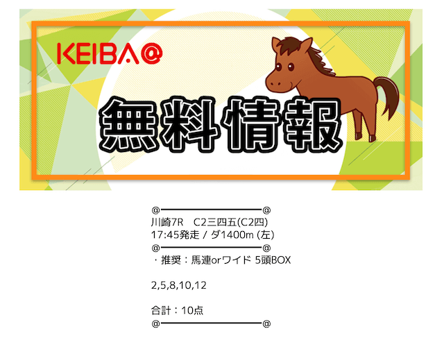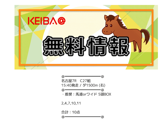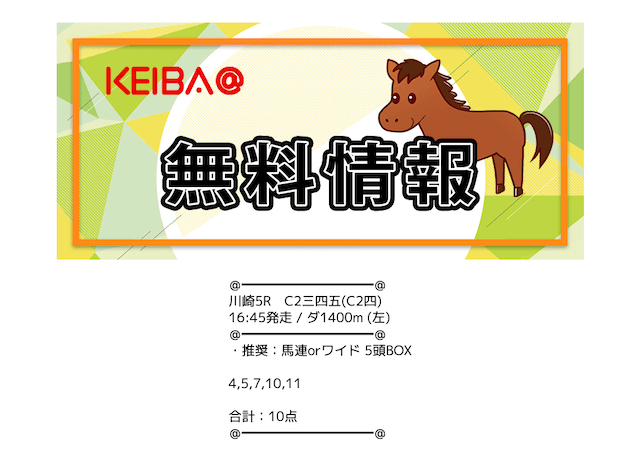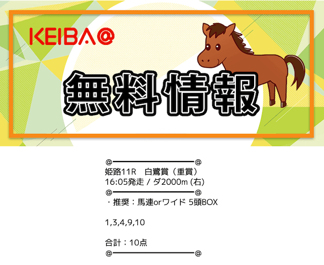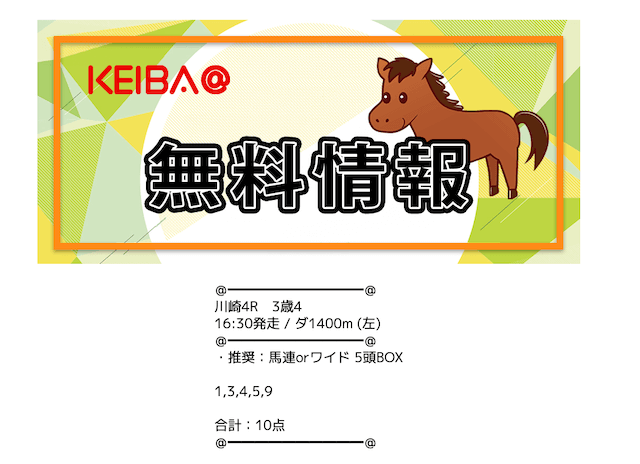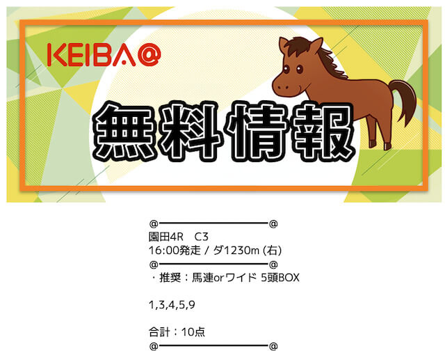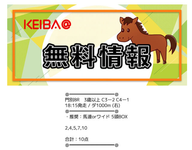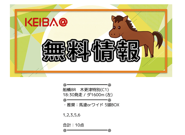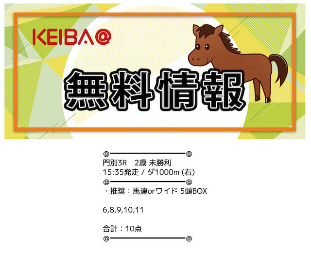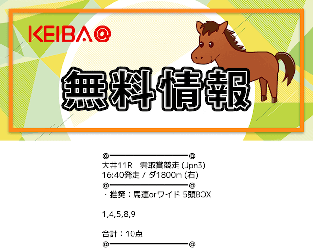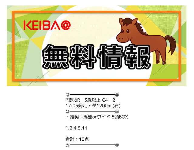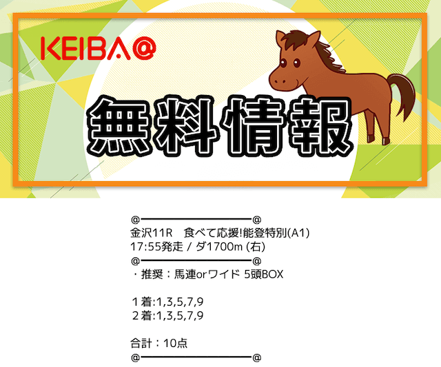 | 買い目公開時間 | 地方競馬:レース当日13時〜13時半 中央競馬:レース前日22時〜当日11時半 |