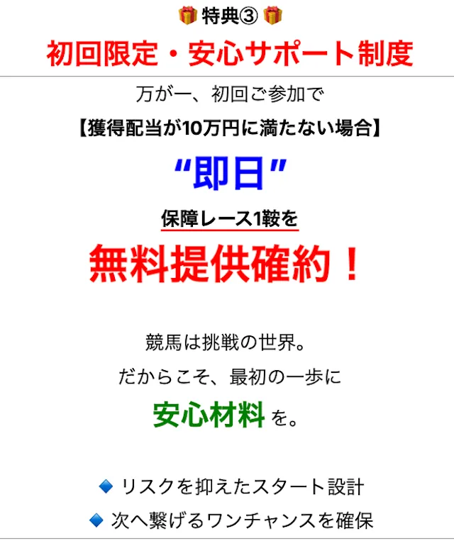 | 保障制度 | ⭕️ | 予想が不的中でも、保障制度が付いている |