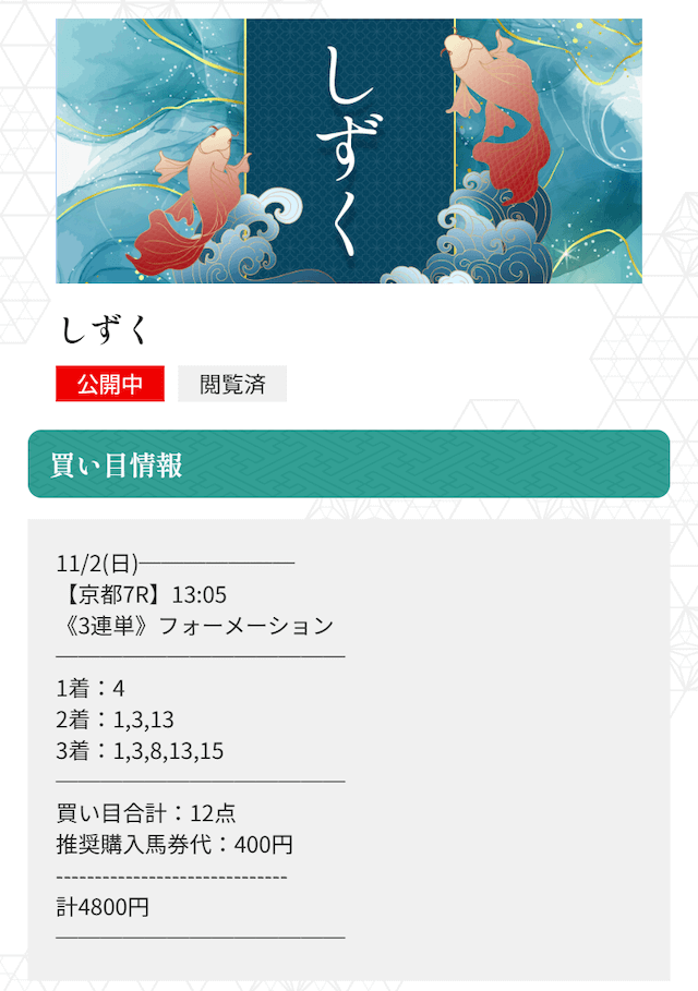 また、有料予想は、定価がやや高額ですが参加したほぼ全てのレースで万馬券以上を的中!