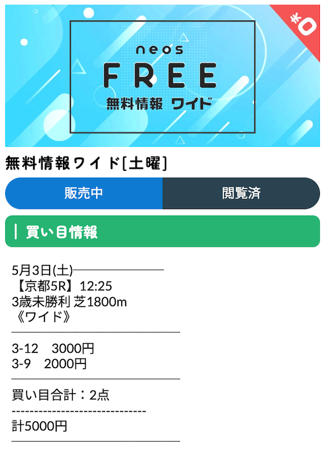 無料予想の安定感レベチ。配当はワイドの時はちょっと物足りない感あるけど、馬券代安いしそこは個人の問題かね。結論ネオスは素晴らしい。