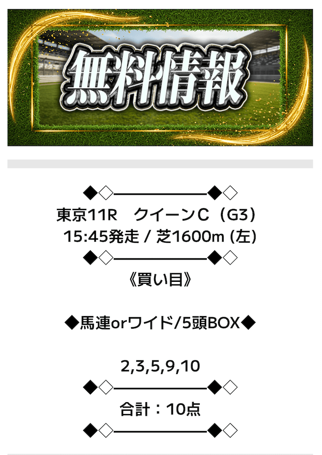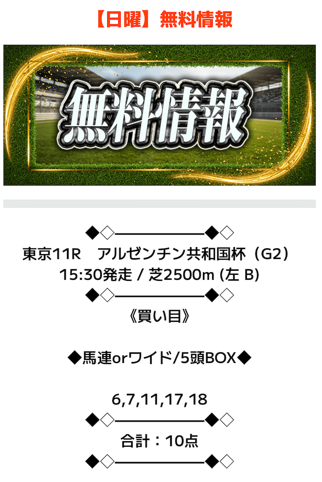 無料情報が毎週コンスタントに当たるので、安定してプラス収支。安心して続けられる。