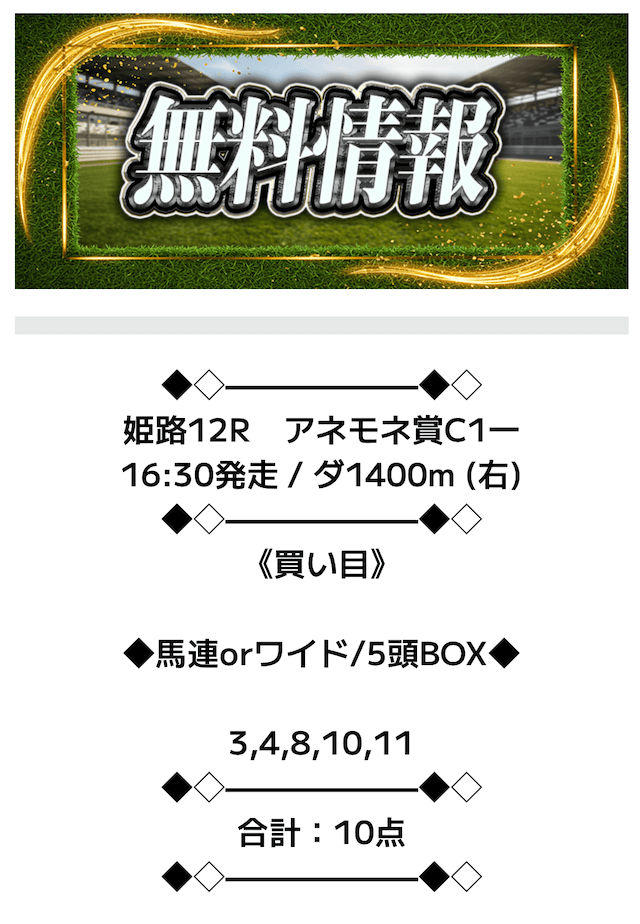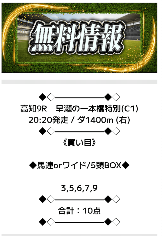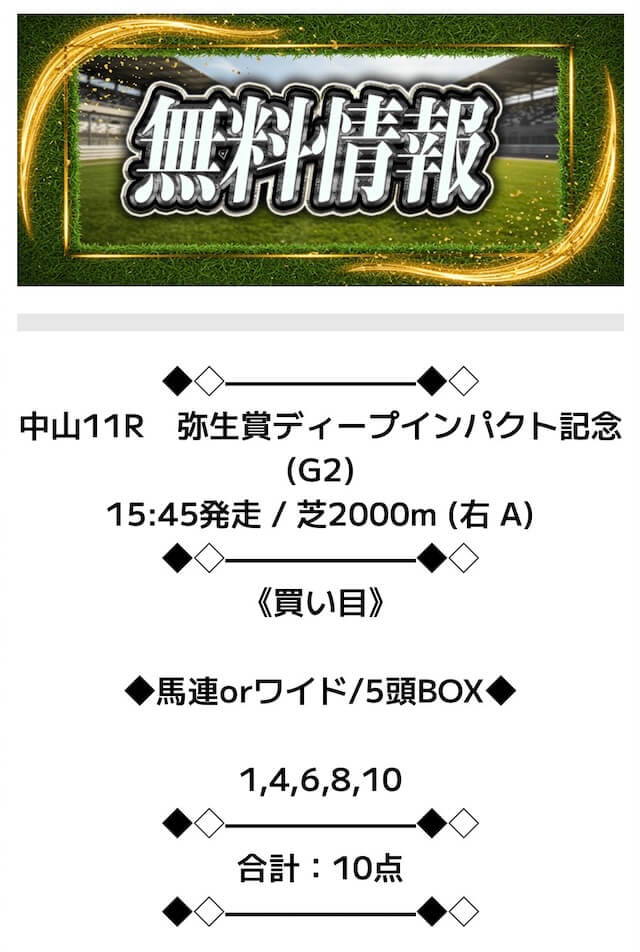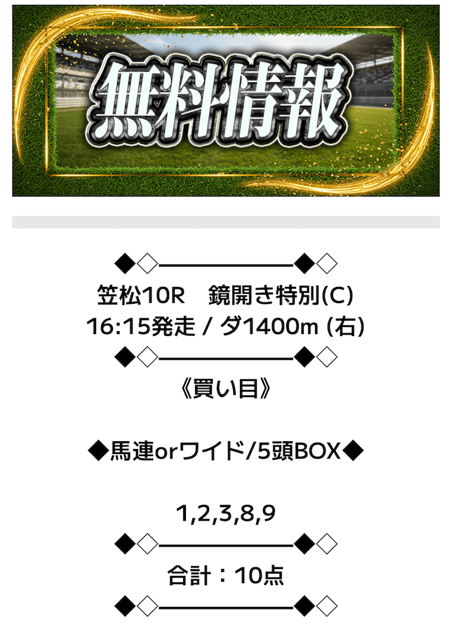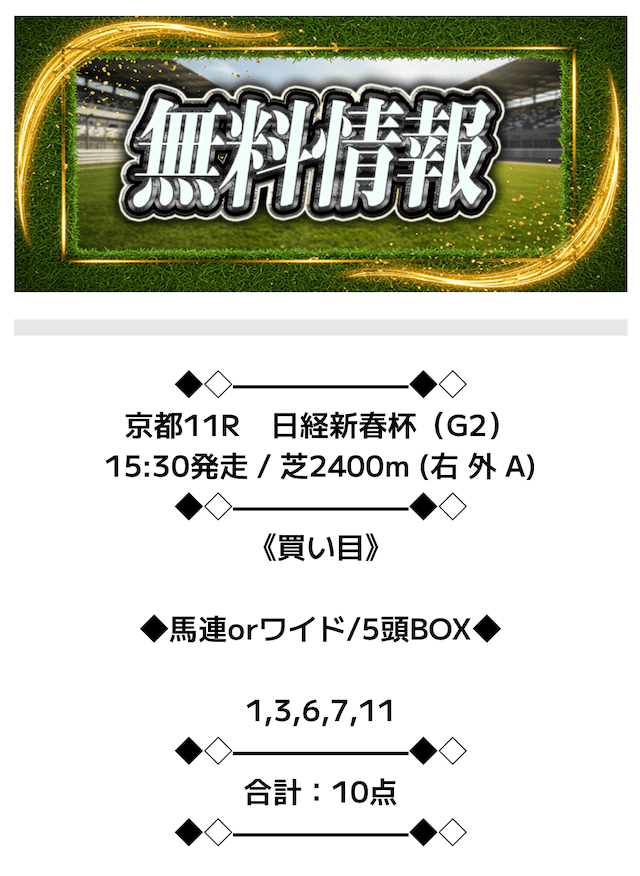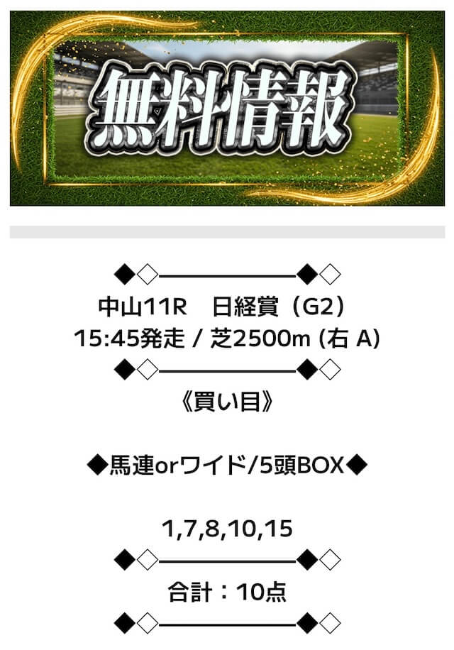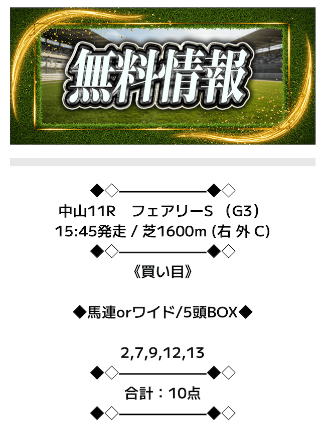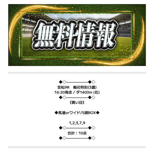 ワイド専門の予想で、買い方がシンプル。的中率も高めで初心者の自分にはちょうどいい感じです。