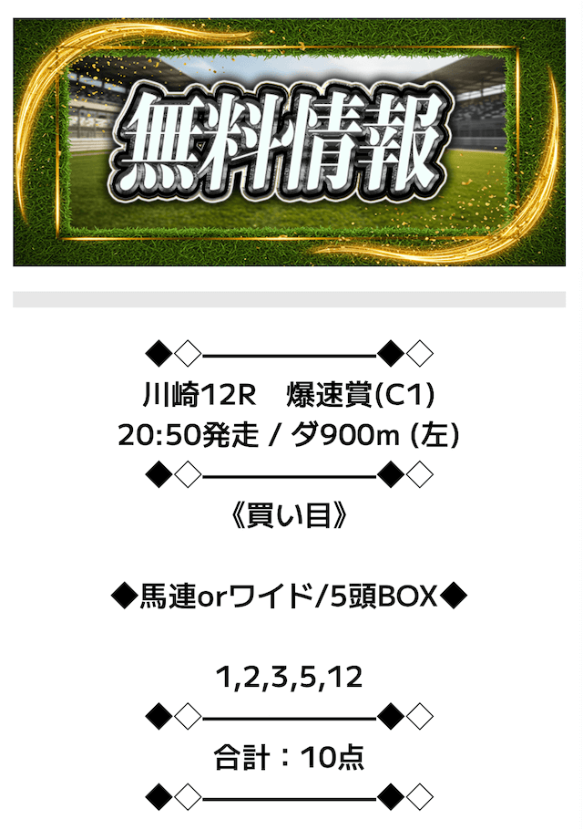 ここ、無料情報の調子が良い感じだよね。ここまでの高配当が当たった時は続けて買った方が良かったのが今までの経験上物語ってるのでヒット&ラン続投いくぜ!初めての参加者にはぴったりだろうね!