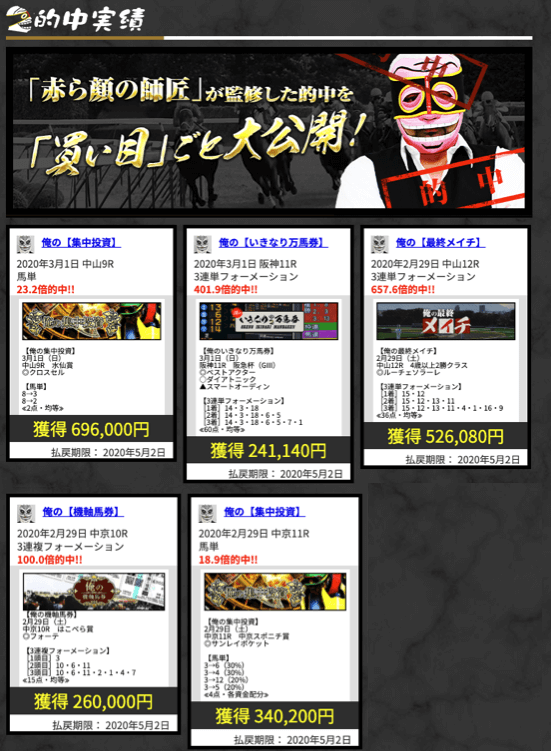 的中実績は、本来会員に公開した予想の結果を公表するものであり、予想が公開できなければ、実績も存在しません。