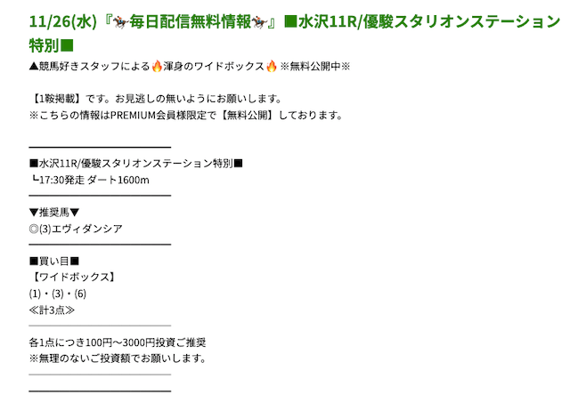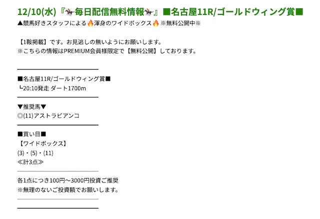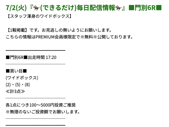 価格も結構リーズナブルだからすぐ始めれると思うのと、情報を割引してくれる頻度も他の競馬予想サイトくらべて多いから継続して参加しやすいのもプレミアムの良さだと思う。 -