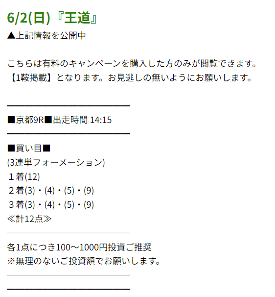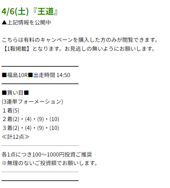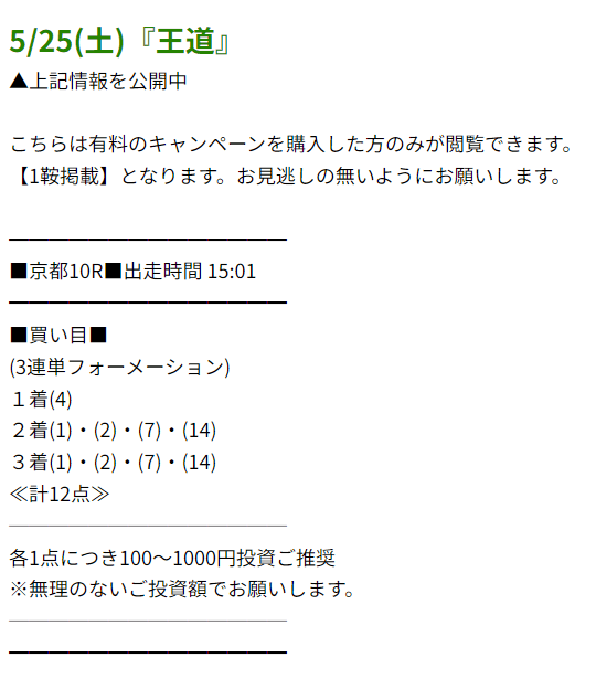 続いて、競馬予想サイトの本領である有料予想に参加していきます。
