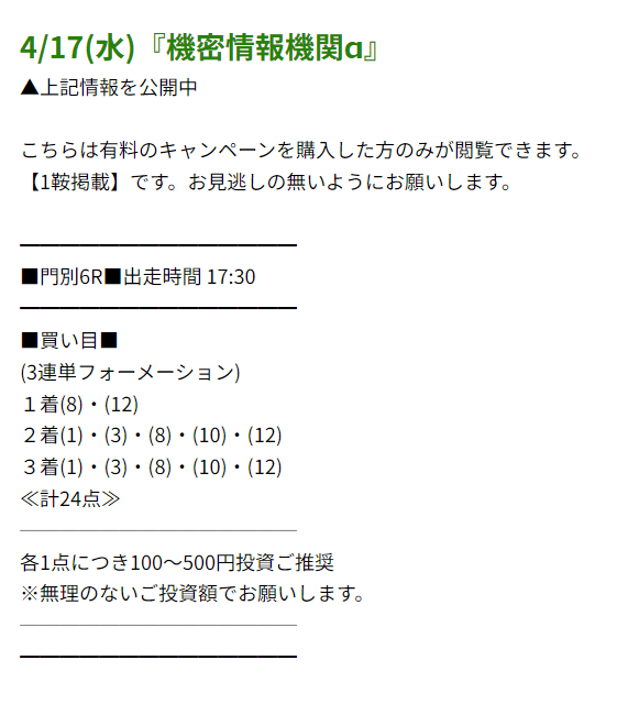| ’25/04/17 門別6R | 機密情報機関α | ◯ | +303,900円 | 100,000円 12,000円 | 415,900円 |