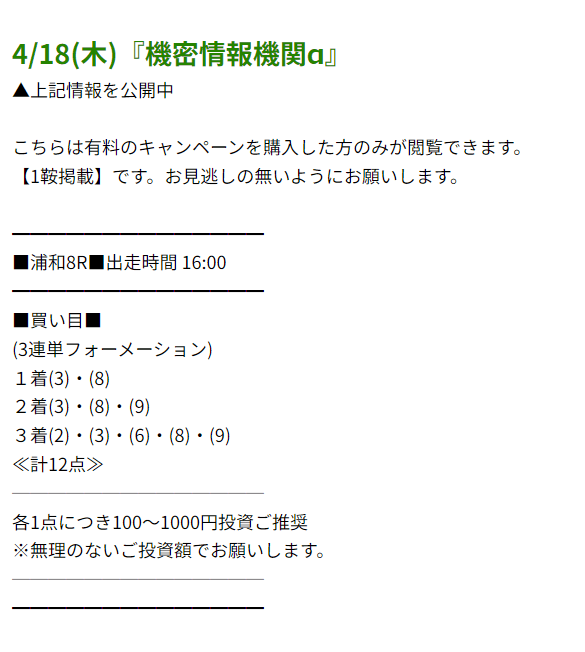 | ’25/04/18 浦和8R | 機密情報機関α | ◯ | +146,500円 | 100,000円 12,000円 | 258,500円 |
