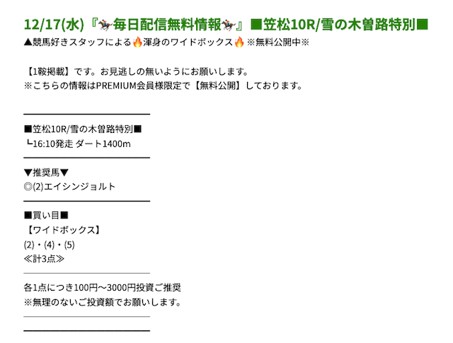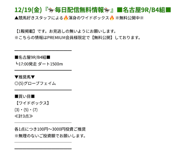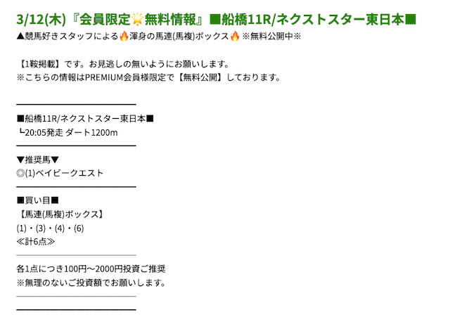 価格も結構リーズナブルだからすぐ始めれると思うのと、情報を割引してくれる頻度も他の競馬予想サイトくらべて多いから継続して参加しやすいのもプレミアムの良さだと思う。