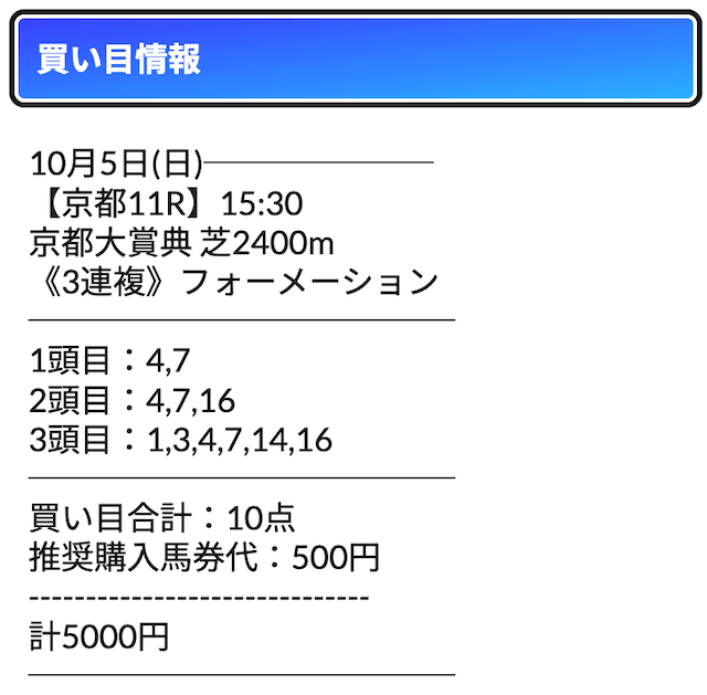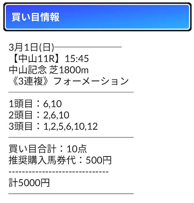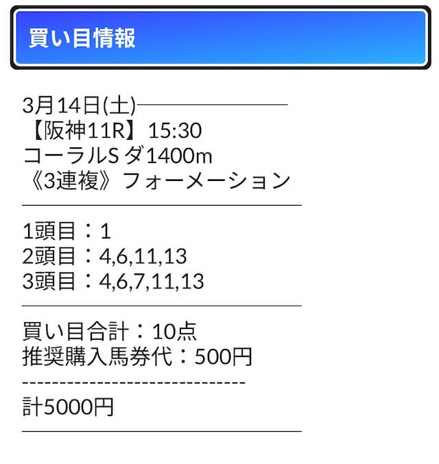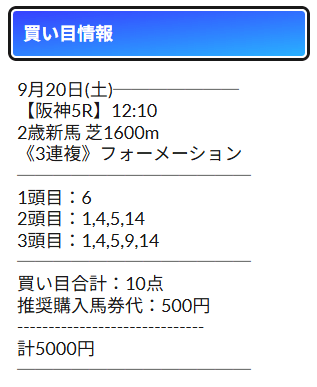 - 馬券代:1点500円 計5,000円