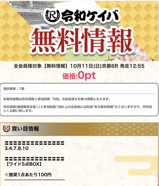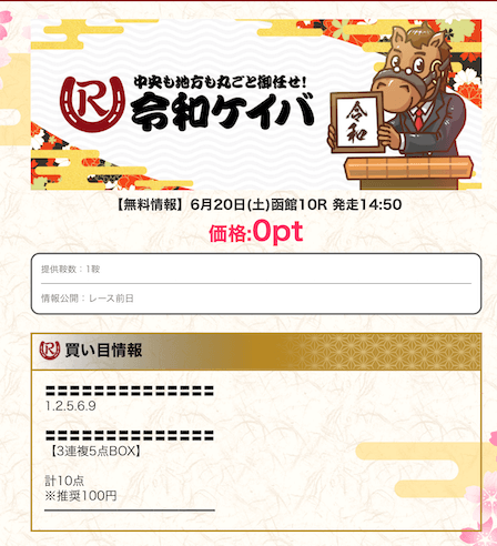 令和ケイバは、自社の公開する無料予想がよく当たると掲げています。
