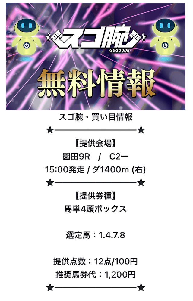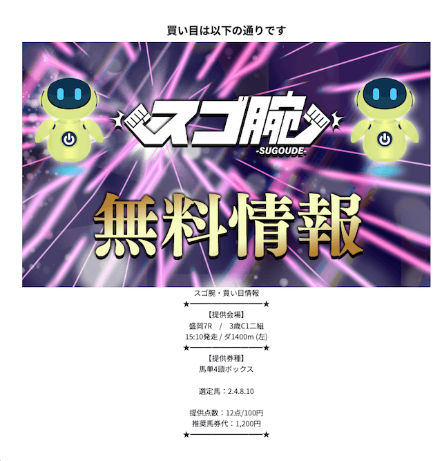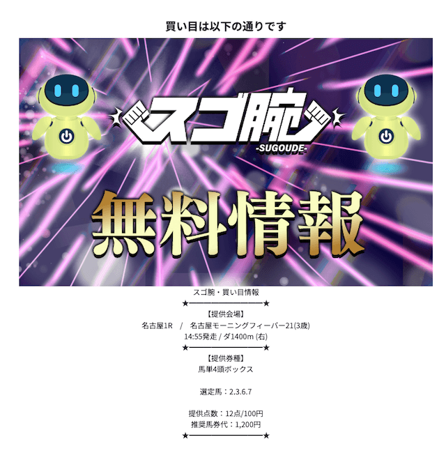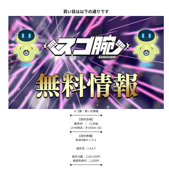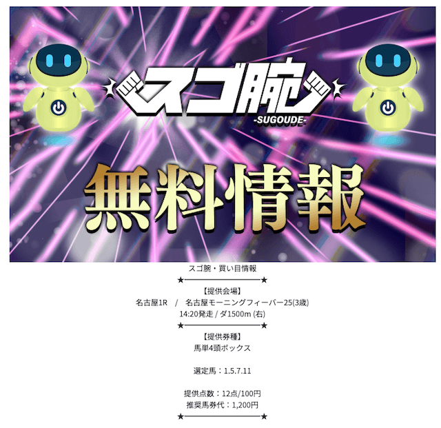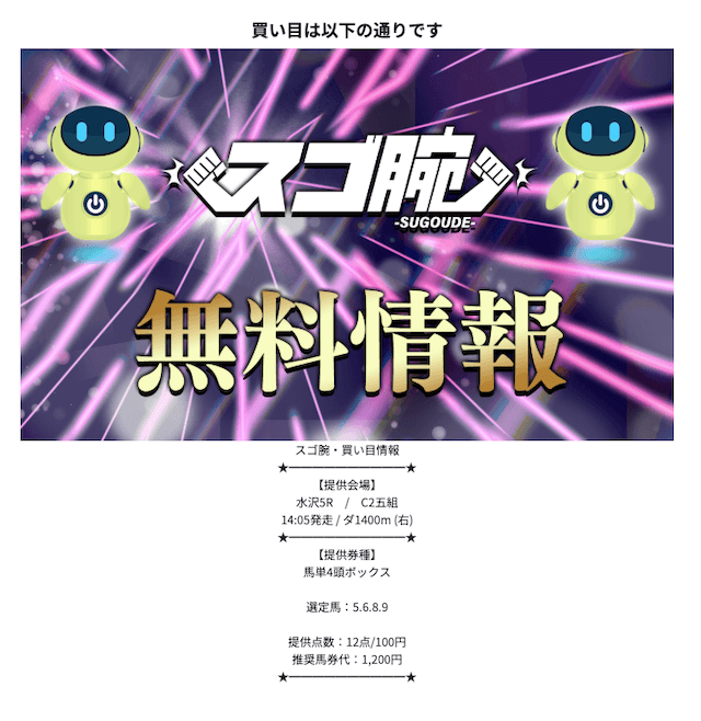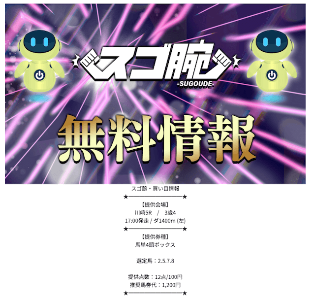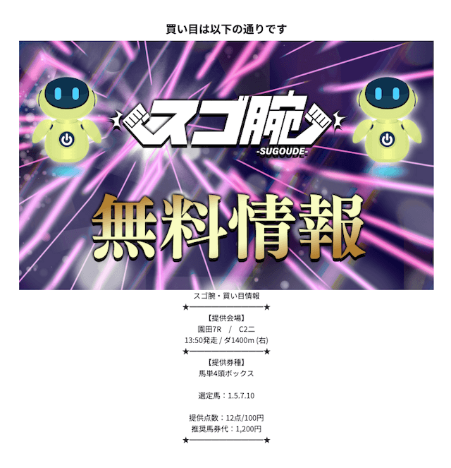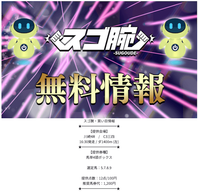 スゴ腕の無料予想は、無料予想ながら当たればかなりの高配当が期待できるそうです。