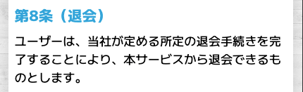 | 退会方法について | △ | 退会できることは、利用規約に記載されていましたが、 明確な手順の記載はなし。 |