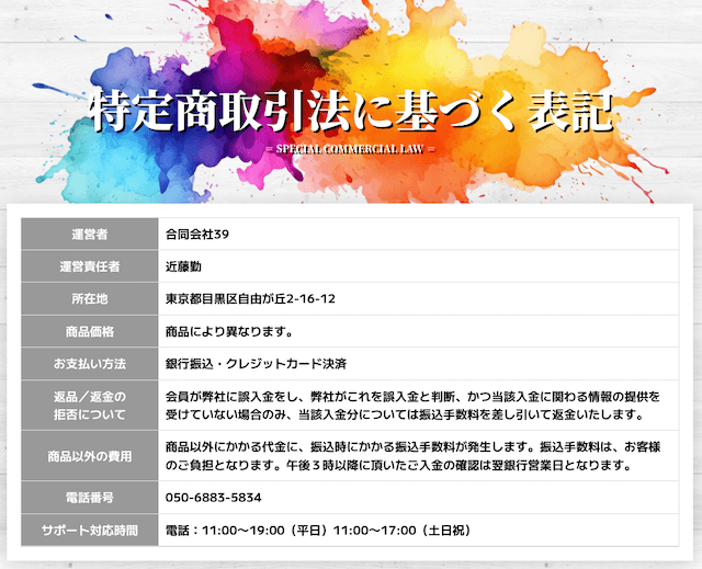 | 特商法に 基づく記載 | ⭕️ | 必要な情報は一通り記載されており、 運営者情報などに関しても特に不明瞭な点は見当たりません。 |