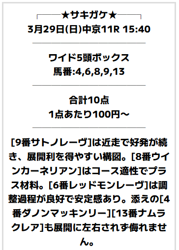 一般的な競馬予想サイトでは、買い目は前日や数時間前に公開されることが多いですが、サキガケはどうやら“直前まで予想を詰めるスタイル”のようです。