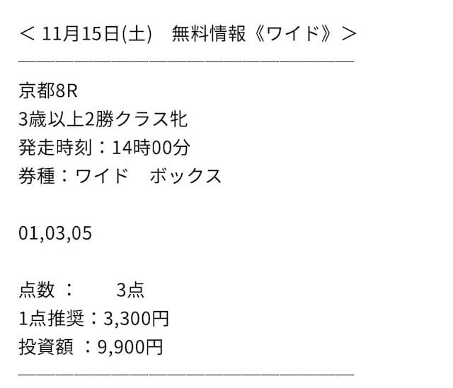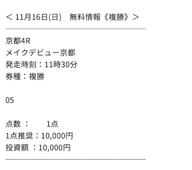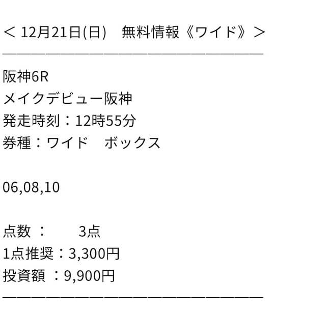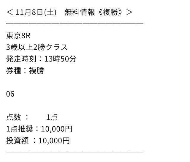 有料情報の値段がちょっと高めなのが気になるところ。しかも予想に乗っかって買うと、馬券代も高額になりがちで、トータルの出費が結構かさむ印象がある。