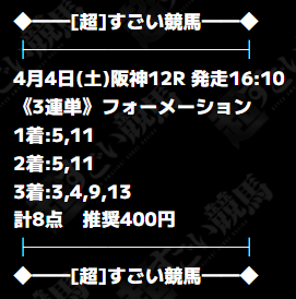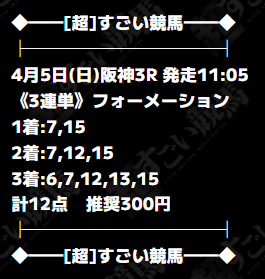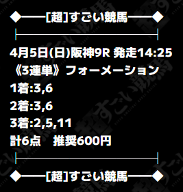 項目/成績 最高成績 最低成績 対象プラン 極月-深淵- 📷️ コズミックディバイド 📷️ 対象レース 2026年4月4日 阪神12R 2026年4月5日 阪神9R 券種/点数 3連単フォーメーション