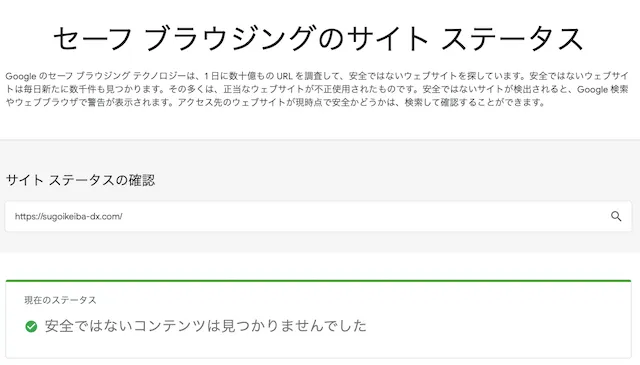 | サイトの安全性 | ⭕️ | 外部の安全性チェックにおいても問題は見られず、 サイト自体は安全に利用できる環境が整っていると判断 |