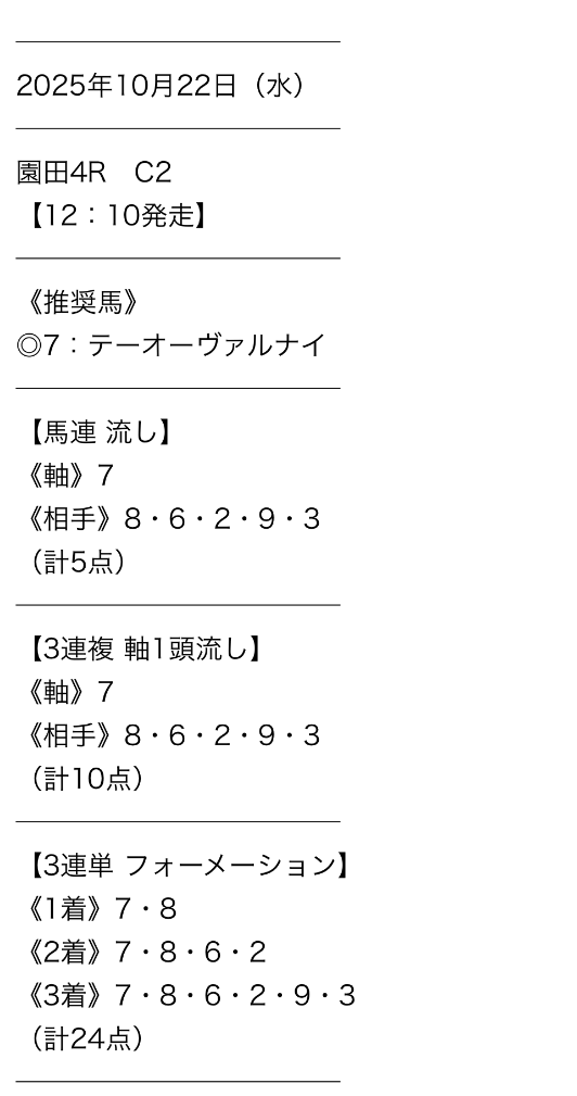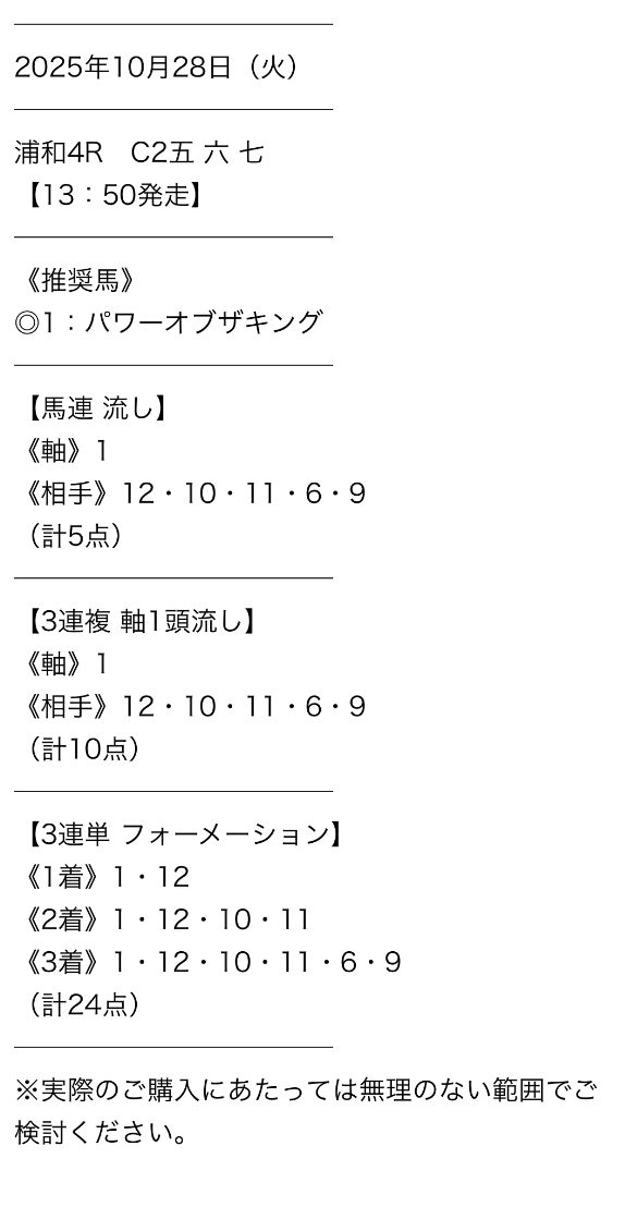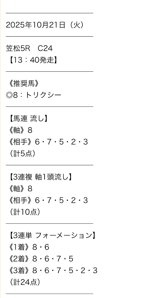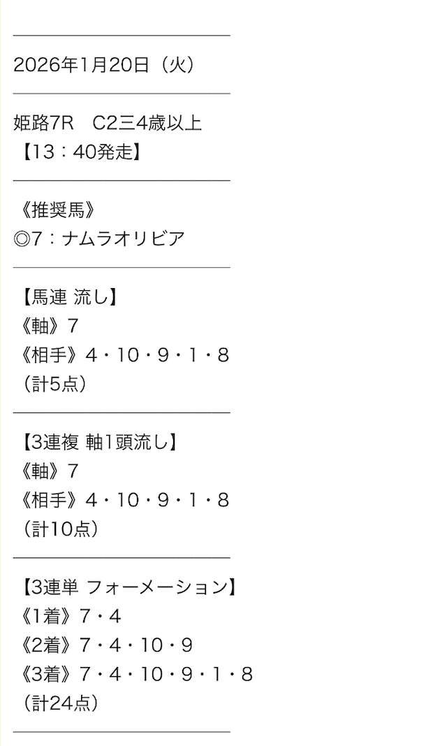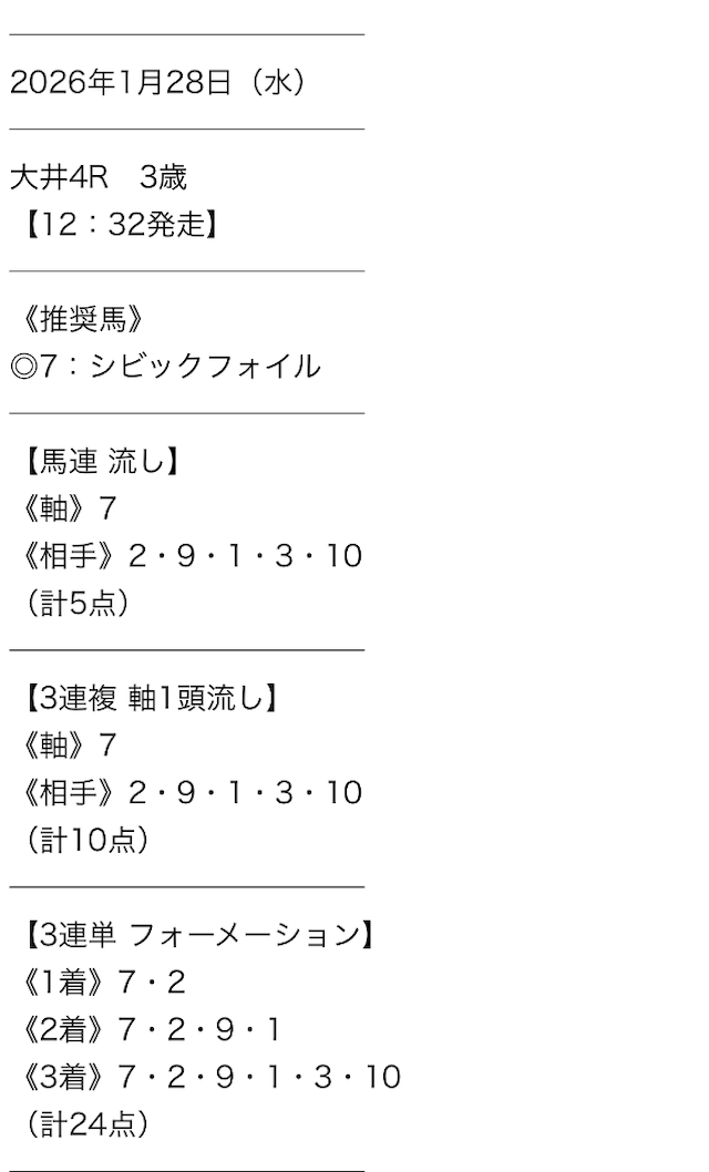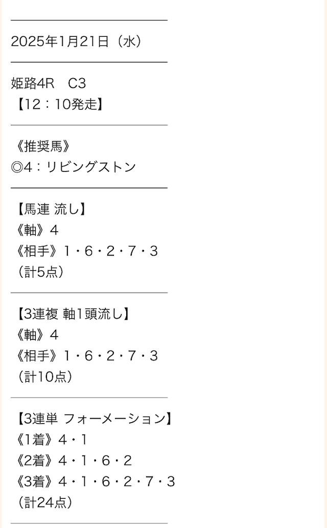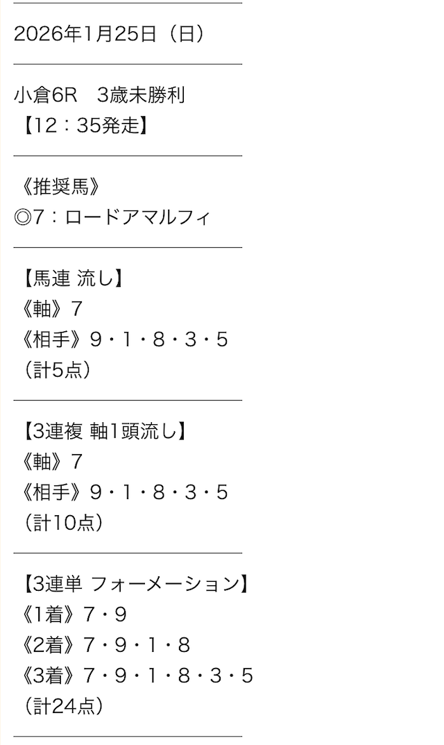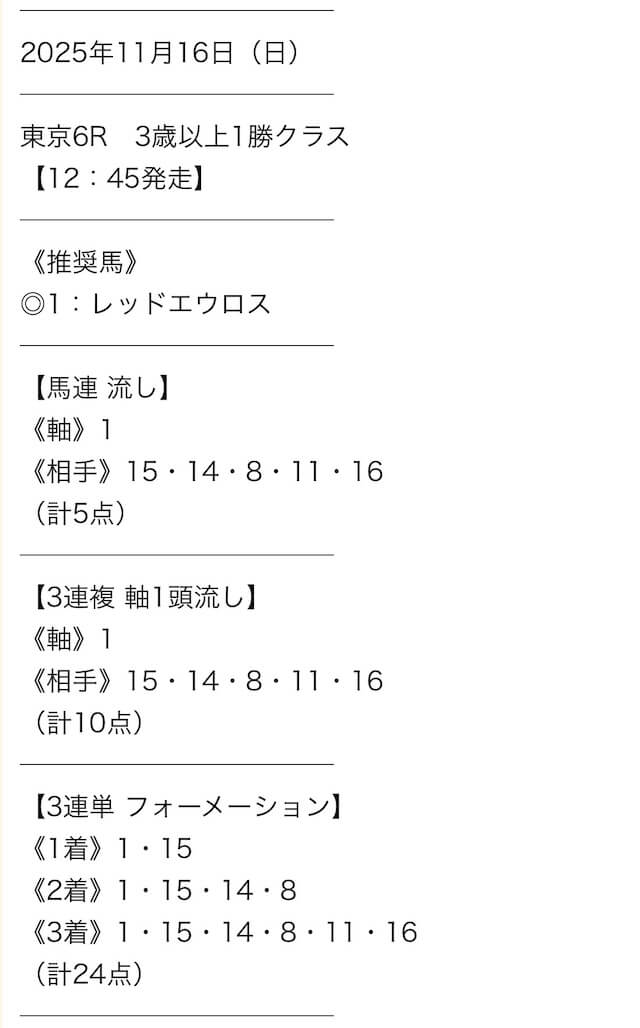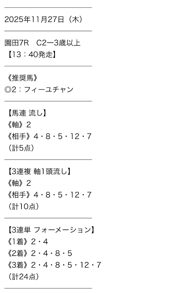 毎日予想を出してくれるのはありがたいんだけど、唯一無料予想の買い目点数が多いところが気になるんだよねぇ。外れた時の損失も多くなるからちょっと怖い・・