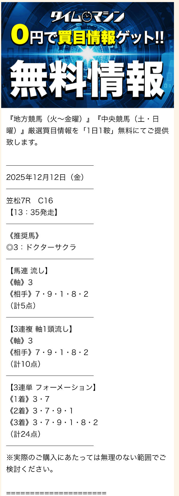 | 2025/12/12/笠松7R | ✕ | 0円 | 5,000円 | -5,000円 | 馬連 |