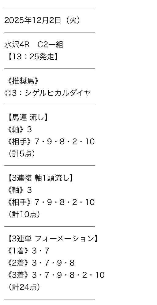 | 2025/12/2/水沢4R | ◯ | 19,900円 | 10,000円 | +9,900円 | 3連複 |