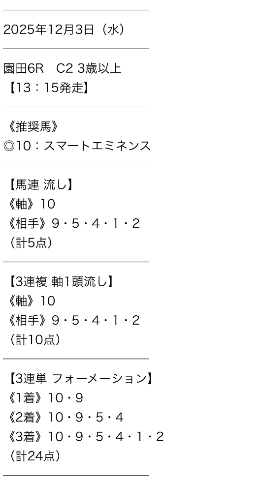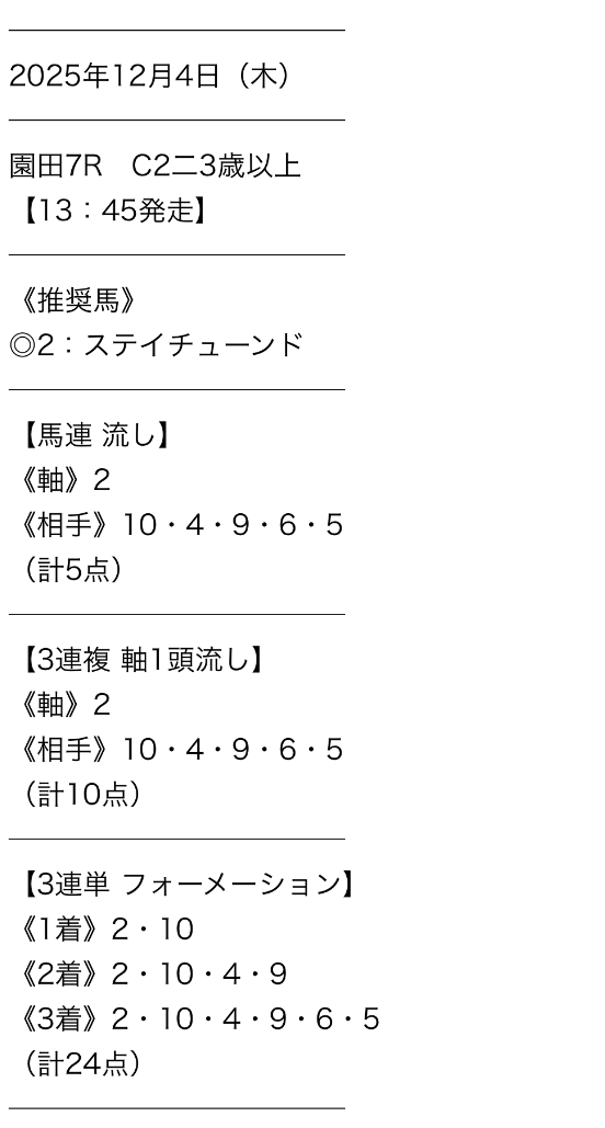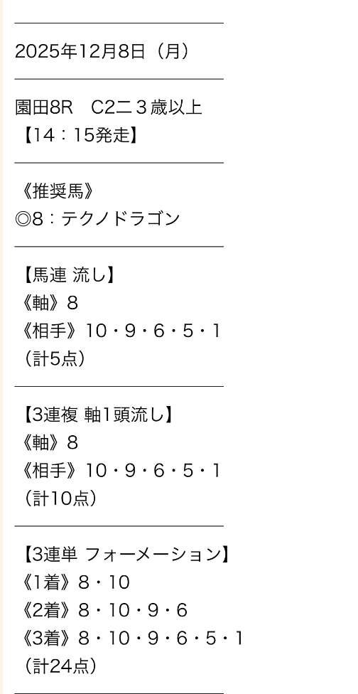 | 2025/12/4/園田7R | ◯ | 15,800円 | 10,000円 | +5,800円 | 3連複 |