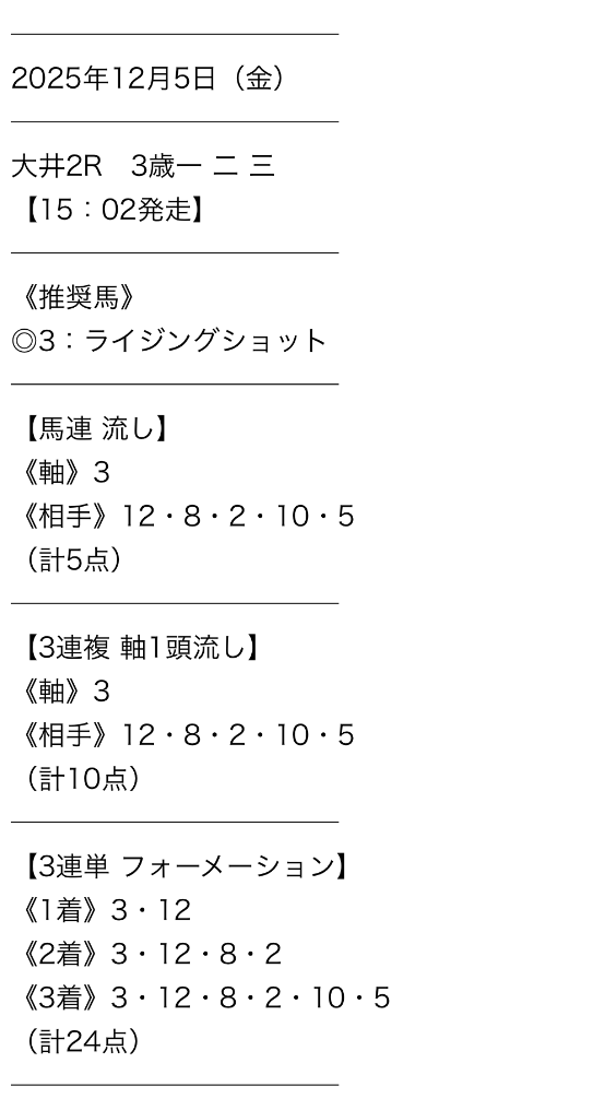| 2025/12/5/大井2R | ◯ | 36,400円 | 29,000円 | +7,400円 | 複数有 |