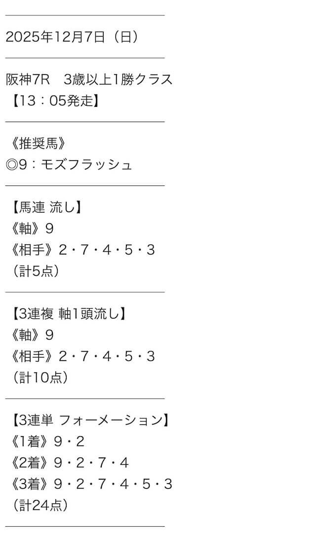 | 2025/12/7/阪神7R | ◯ | 14,100円 | 10,000円 | +4,100円 | 3連複 |
