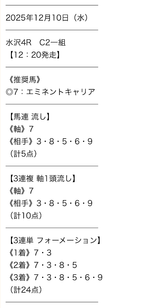 | 2025/12/10/水沢4R | ◯ | 18,300円 | 10,000円 | +8,300円 | 3連複 |