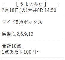 買い目はワイド5頭BOXで組まれており、点数は10点。