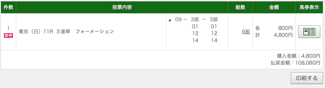 この10万円を用いて、買い目通りに馬券を購入していきます。