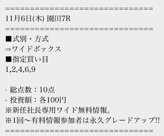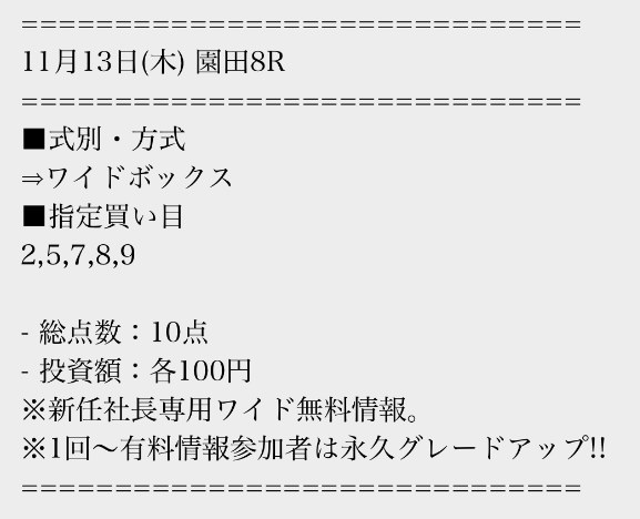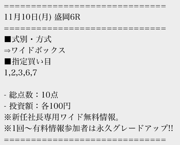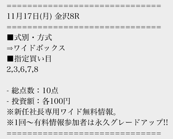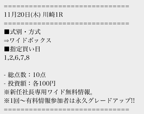 無料予想、ワイドで日によってはかなり人気寄りでトリガミになることもあるけど、その分大崩れは少なくて連敗したことほぼない!負けないってかなり大事だから、個人的にかなり信頼してる