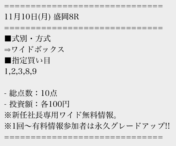 情報料金に加えて馬券代の負担が気になっていたのですが、社長KEIBAはその点が良心的でした。1鞍5000円で固定されているため、トータルの費用感が分かりやすいです。他サイトでは1万円以上のところも多かったので、安心感があります。また、提供される買い目の精度も高く、満足しています。特に重賞レースの的確な読みは印象的でした。今後も継続して参加したいと思います。