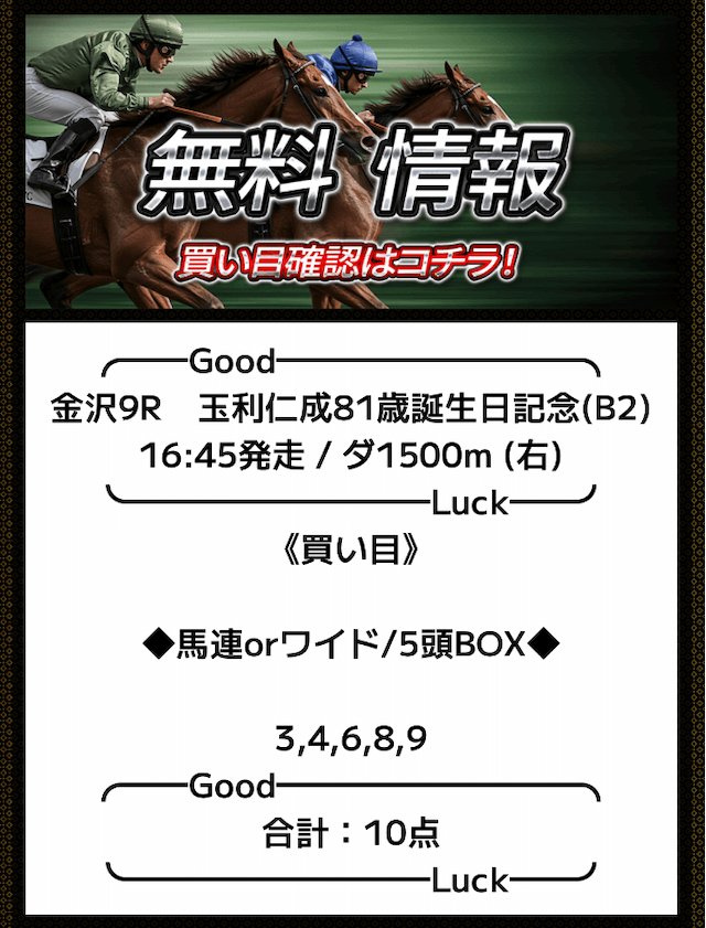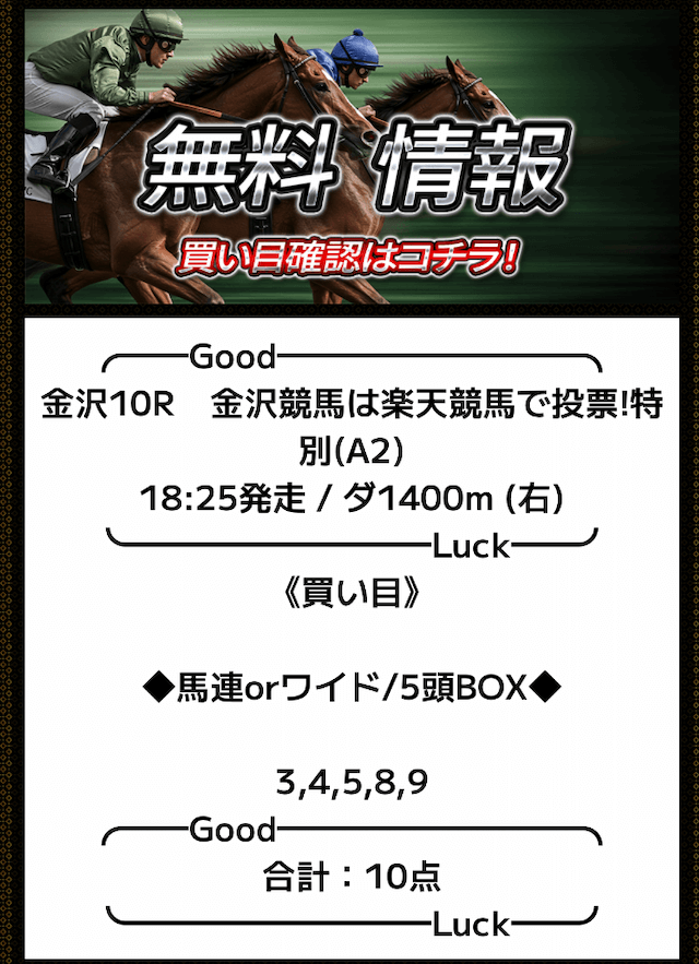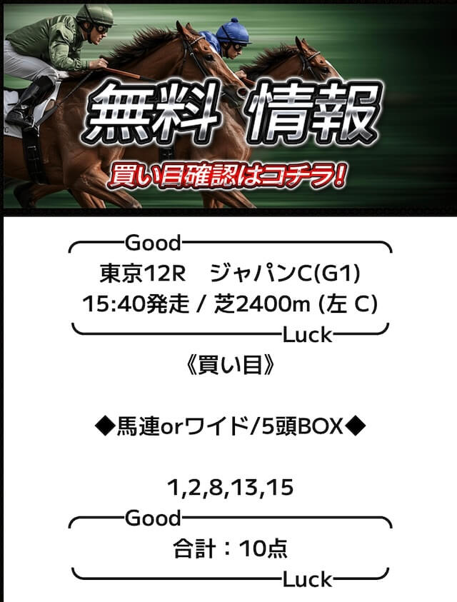 情報料金がちょっと高めなのがネック。その分しっかりした内容を期待したいところ。でも、有料予想が売り切れてることがあって、欲しいタイミングで買えないのはちょっと残念。もう少し買えるようにしてもらえると助かる。