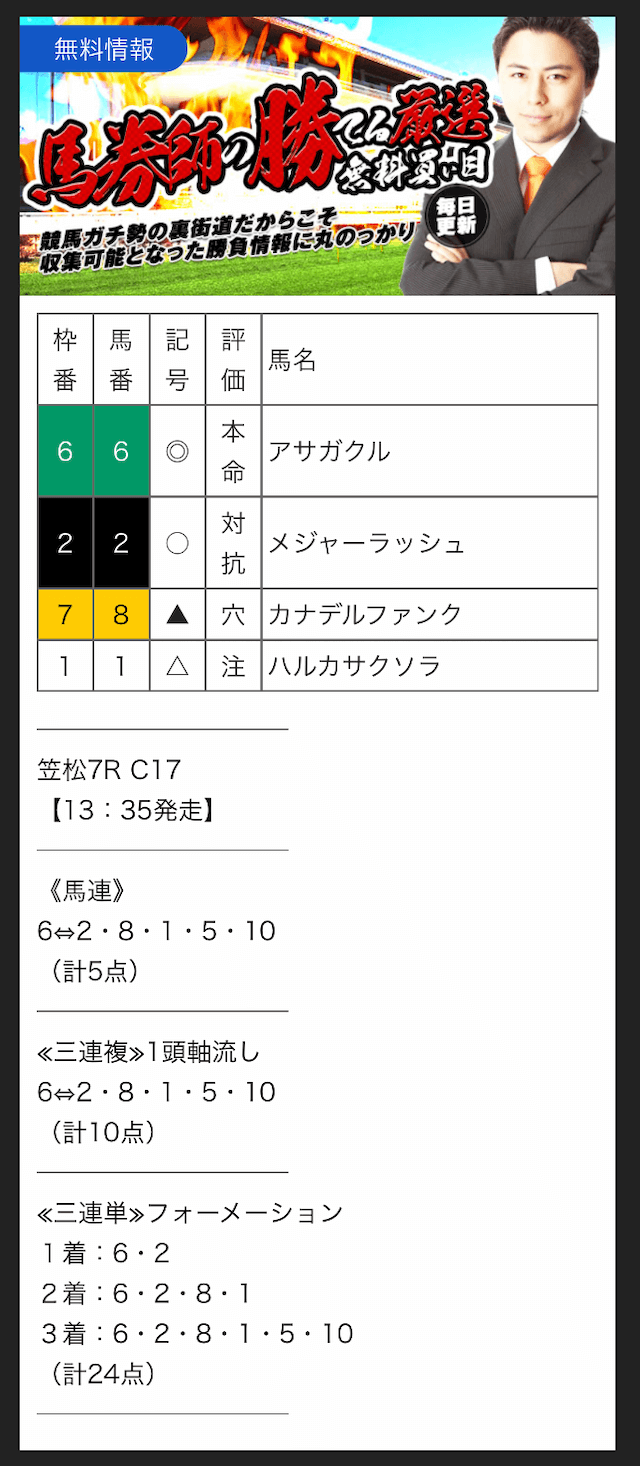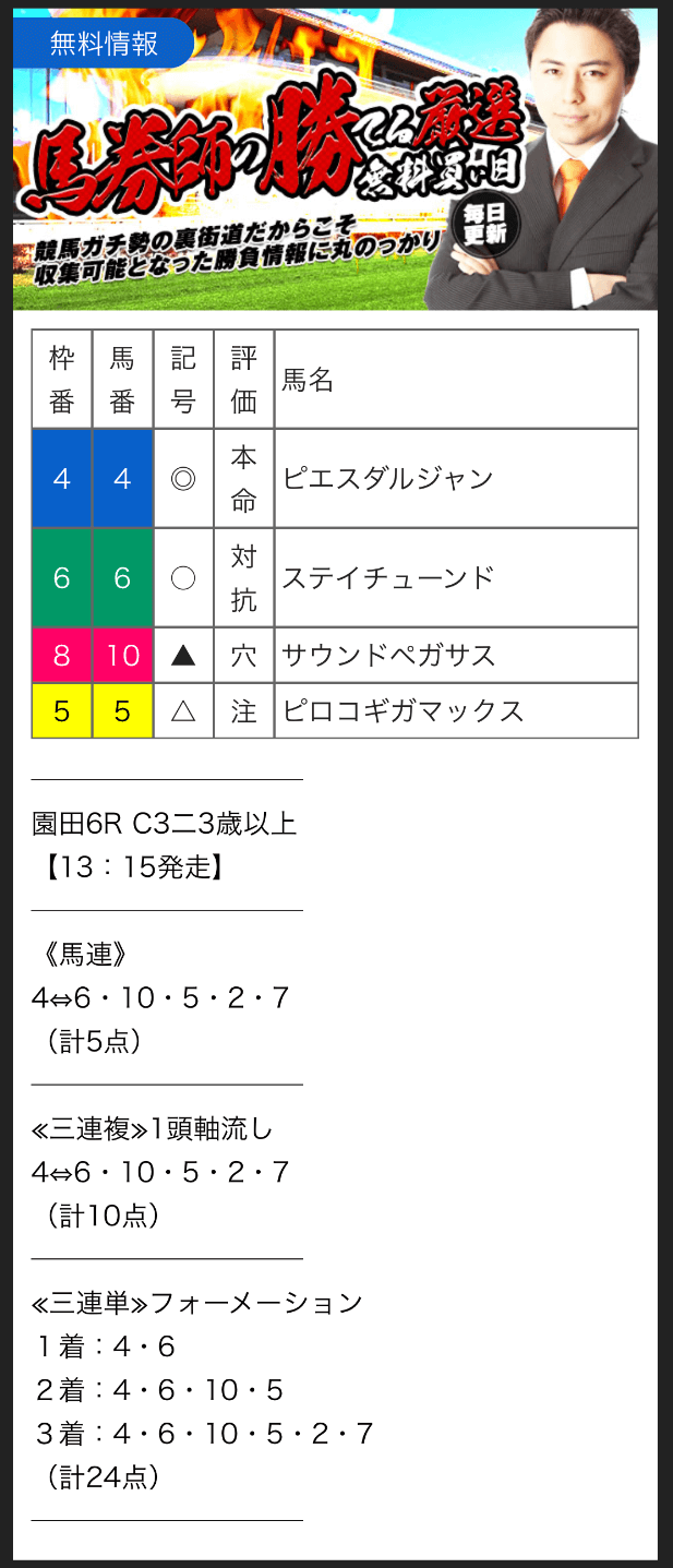 では、準備した軍資金10万円を使って、競馬裏街道の無料予想に参加していきます。