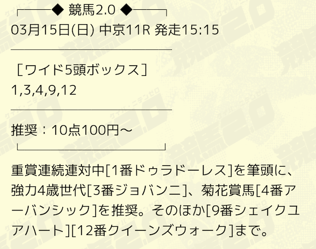 その分しっかり当たるんだけどね公開券種はワイドかつ堅い馬を抑えて予想していることから、配当が少ない傾向にあるようです。