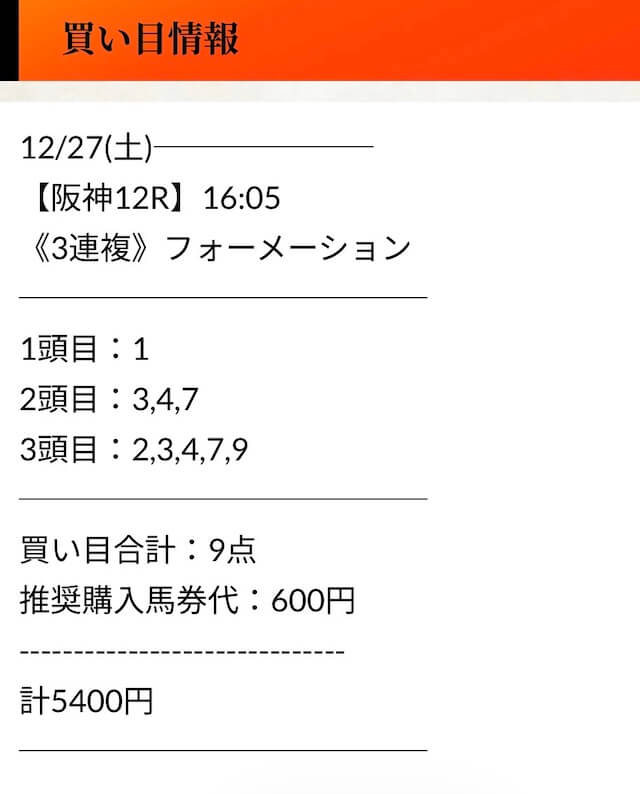 | 2025/12/14/阪神11R | ✕ | 0円 | 5,400円 | -5,400円 | 3連複 |