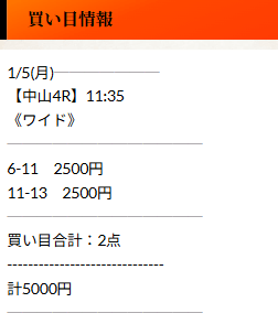 | 2026/1/5/中山4R | ◯ | 5,750円 | 5,000円 | +750円 | ワイド |