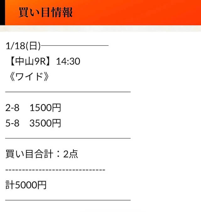 | 2026/1/18/中山9R | ◯ | 9,450円 | 5,000円 | +4,450円 | ワイド |
