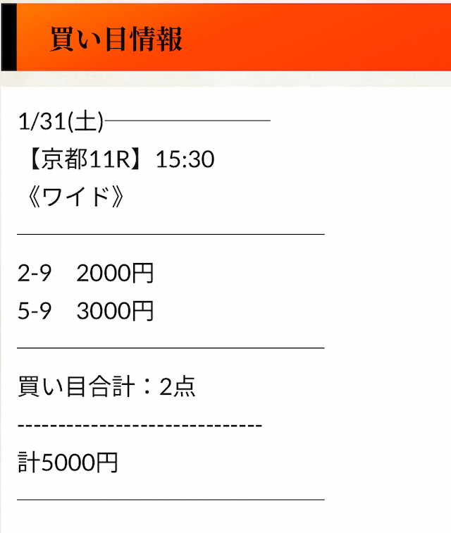 | 2026/1/31/京都11R | ◯ | 7,800円 | 5,000円 | +2,800円 | ワイド |