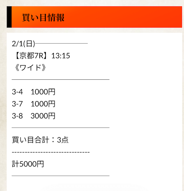 | 2026/2/1/京都7R | ◯ | 5,700円 | 5,000円 | +700円 | ワイド |