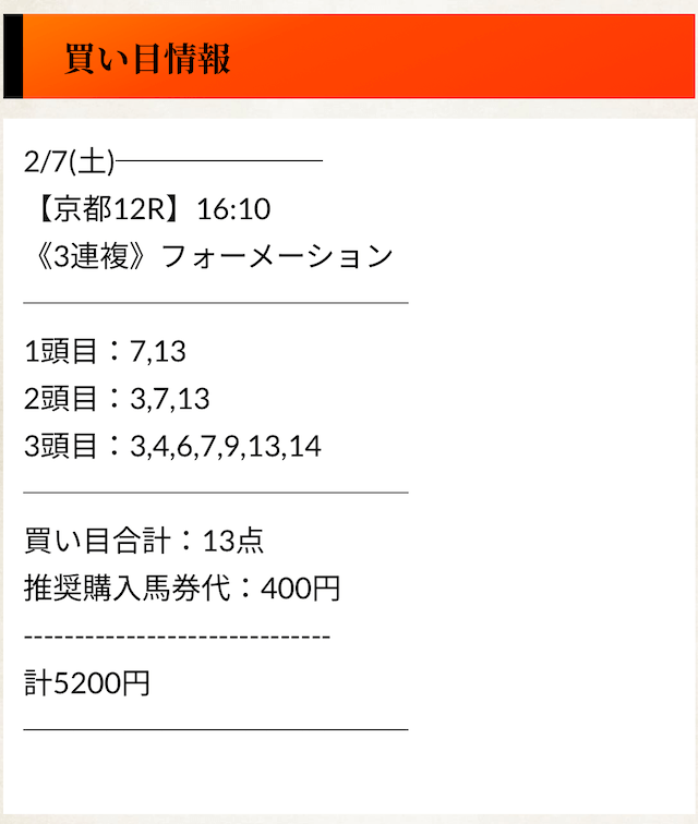| 2026/2/7/京都12R | ◯ | 10,880円 | 5,300円 | +5,580円 | 3連複 |